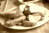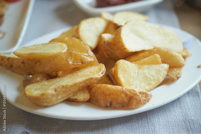 Crispy golden potato wedges served on a white plate