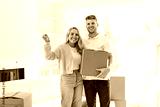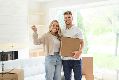 Young couple moving in new home. Couple is having fun with cardboard boxes in new house at moving day.