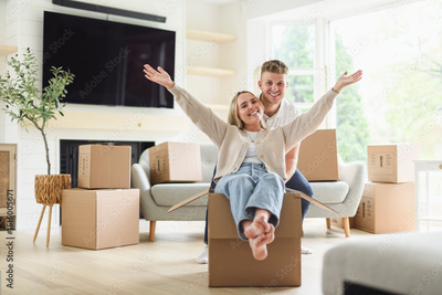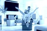 Young couple moving in new home. Couple is having fun with cardboard boxes in new house at moving day.