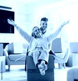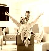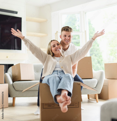 Young couple moving in new home. Couple is having fun with cardboard boxes in new house at moving day.