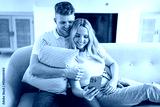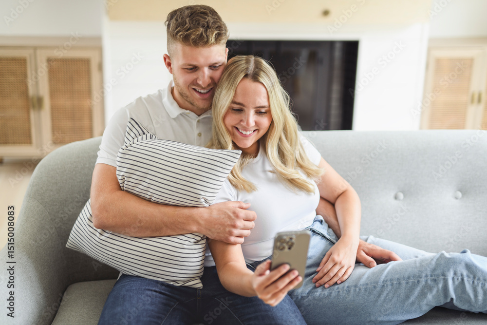 lovely young couple relaxing and watching cellphone at home sofa
