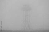 Observation tower in fog. Foggy day with a tall tower in the distance. The tower is surrounded by a field and he is a lookout tower