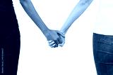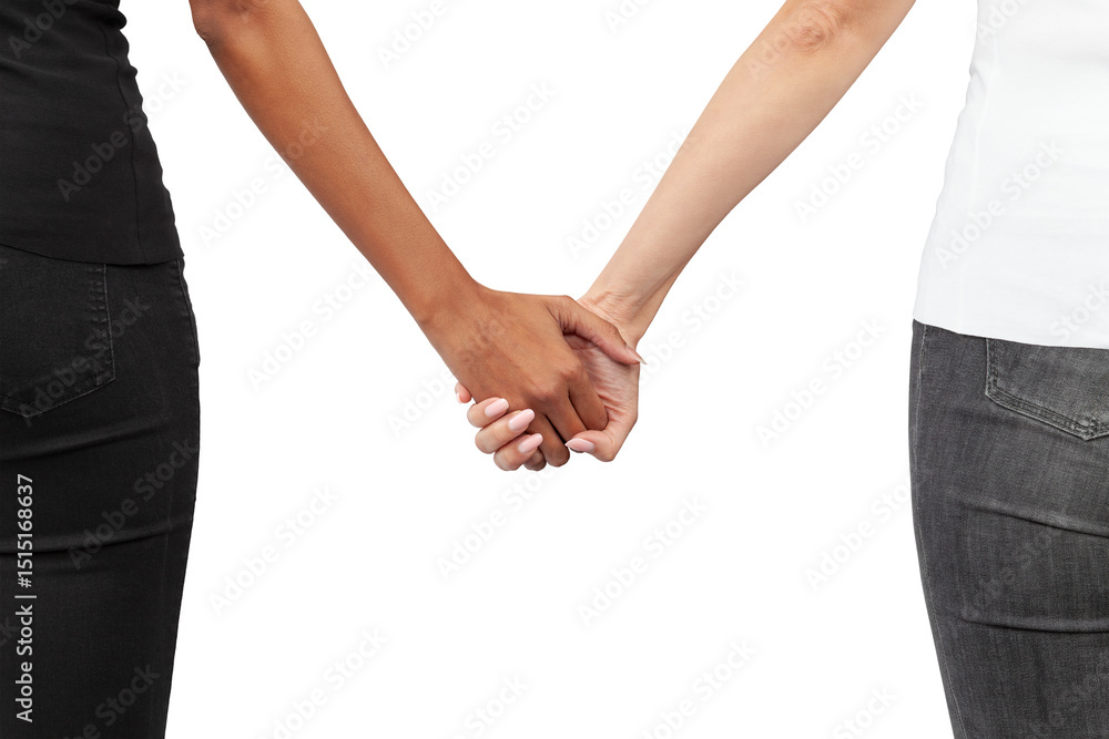 Interracial women couple holding hands closeup. Symbol of LGBTQ pride, love, racial diversity, inclusion, equality, human rights, togetherness, and unity. Isolated on white background