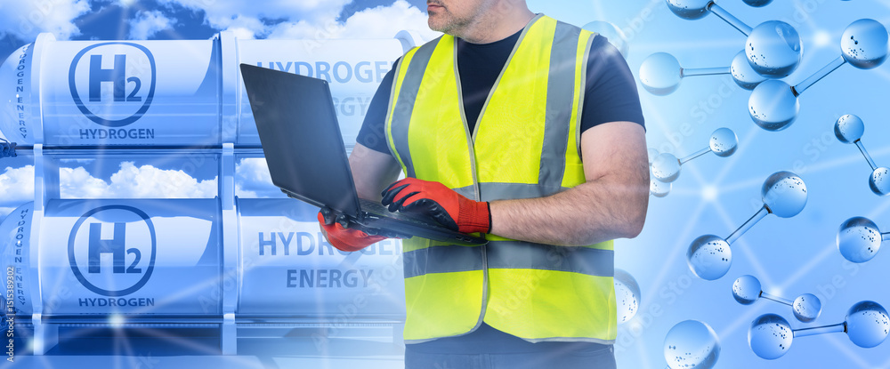 Hydrogen energy. Man with laptop working at enterprise. Cropped hydrogen energy specialist with computer. H2 gas production. Career in hydrogen energy industry. H2 gas tanks. Industrial innovations