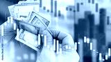 Crisis in Italy. Hands of man counting banknotes. Flag of Italy. Falling financial chart metaphor of crisis. Recession in Italy. Decrease in amount of investment concept. Fall in income of Italians