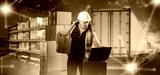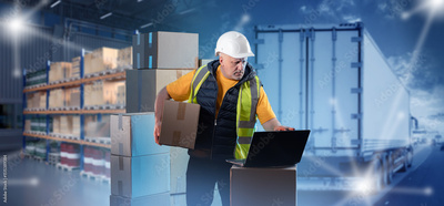 Man fulfillment specialist. Worker with boxes manages logistics. Truck driving on road near fulfillment manager. Man in uniform standing in warehouse. Fulfillment specialist uses laptop