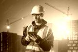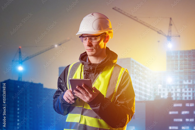 Builder man holding tablet. Specialist architectural company. Builder near multi-storey residential complex under construction. Erection of building. Night portrait of man builder in yellow vest.