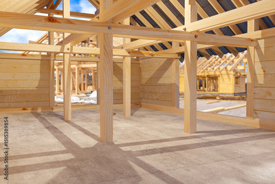 Wooden house under construction. Erection of cottage from bar. Frame construction. Interior unfinished building. Construction of house from boards and plywood. Erection of house with wooden supports