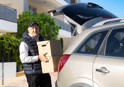 Man with boxes near car. Guy carrying packages out of house. Cardboard boxes for moving. Man putting boxes in trunk. Male with cardboards during relocation. Transportation of containers during moving