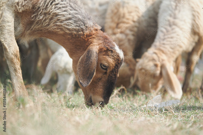 Goats grazing on grass in a sunny pasture during daytime