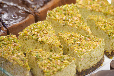 Delicious pistachio dessert displayed at the bakery
