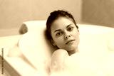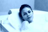 Calm young woman enjoying a relaxing bath in a bubble-filled jacuzzi, surrounded by a soothing bathroom ambiance. Self-care and wellness concept.