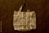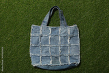 Handmade denim bag on green background, top view