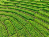 Green rice terrace field landscape. Eco living, organic farming, and mountain terraces in countryside. Eco tourism. Traditional farming, sustainable agriculture, and peaceful rural. Local travel.