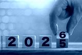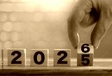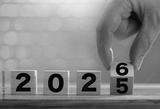New year change concept. Fingers turning the calendar board block from 2025 to 2026. Graphic poster work for the end and beginning of the year