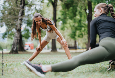 A group of women engaged in stretching exercises on grass in a green park, fostering fitness and teamwork.