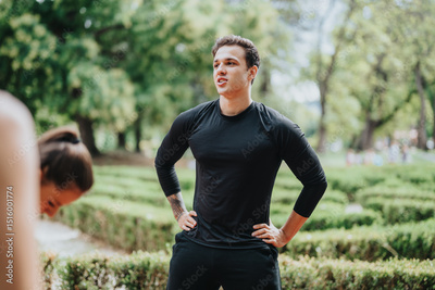 Group of friends engaging in outdoor fitness activities in a green park, showing teamwork, motivation, and an active lifestyle.