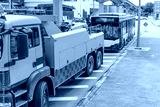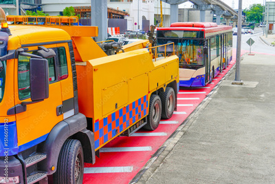 Repair and recovery vehicle evacuation on the emergency side of the road, ready for towing a broken city bus