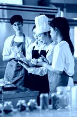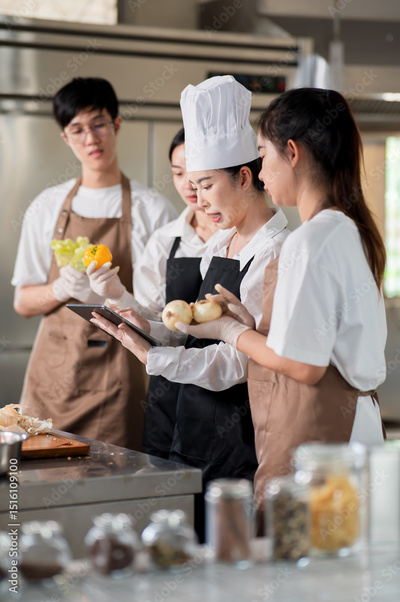 Asian female chef holding a tablet reading recipe to students or assistants over a kitchen counter.