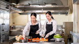 Female chef choosing the carrot in the bowl for her student or assistant at kitchen cooking counter.