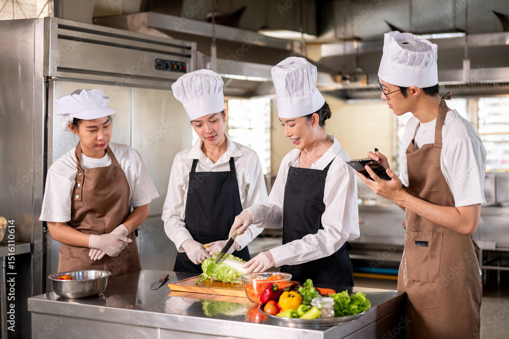 Female chef is teaching and showing how to cut cabbage to students or assistants at kitchen counter