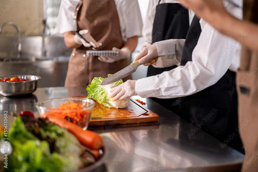 Chef holding knife cutting cabbage on chopping board with students or assistants at kitchen counter