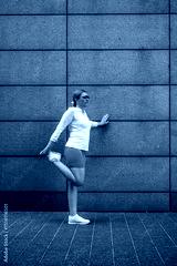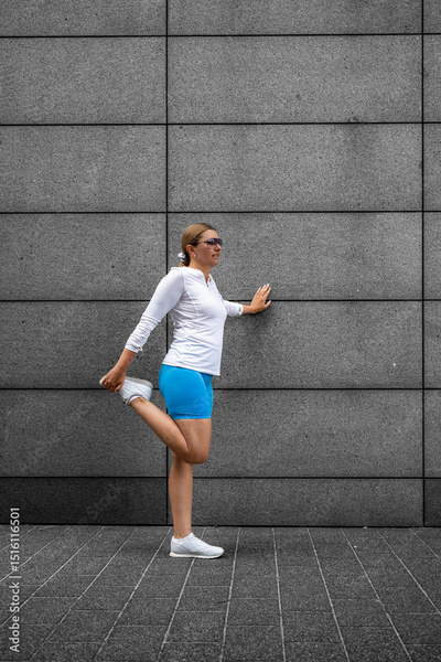 Beautiful mature woman doing stretching exercises after running against concrete wall background. Side view