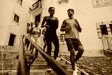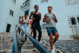 Group of athletes running up stairs in urban setting, promoting fitness and well-being