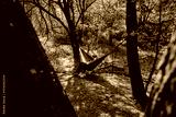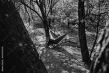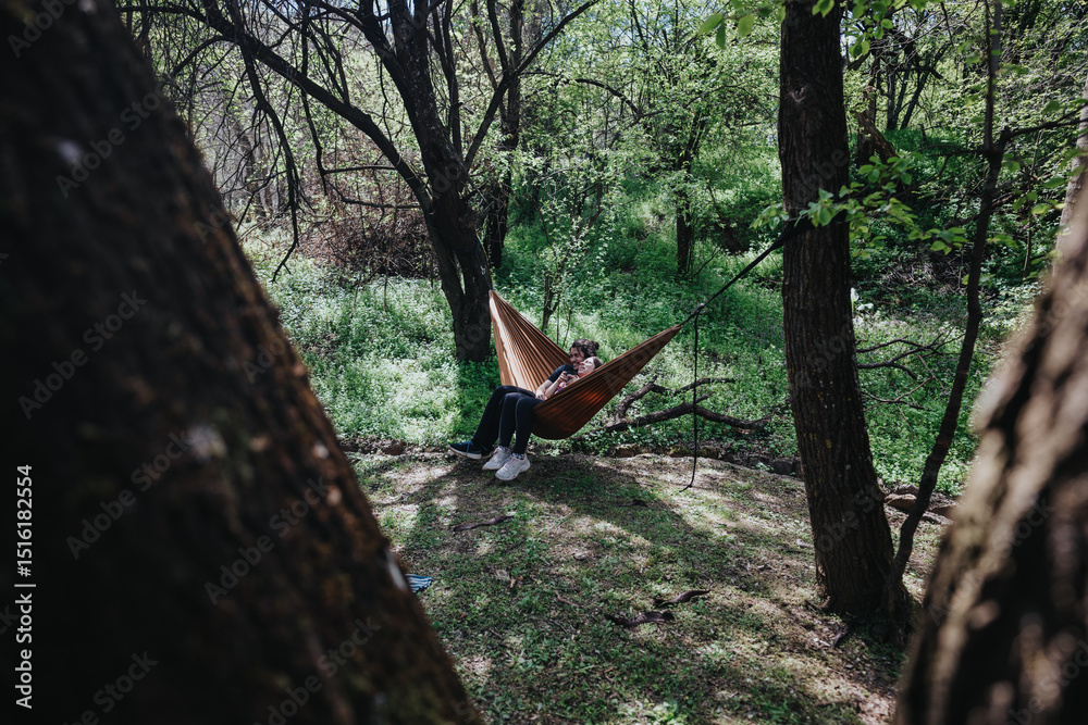 Serene moment captured of a young couple resting on a hammock in a lush green forest, showcasing natural tranquility and togetherness in the great outdoors.