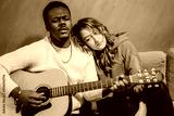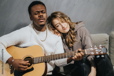 A man strumming an acoustic guitar while a woman leans on his shoulder, expressing affection and intimacy, creating a heartfelt scene of music and emotion. Perfect for artistic and emotional concepts.