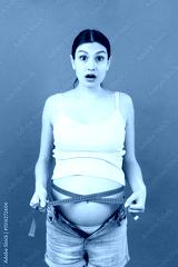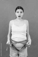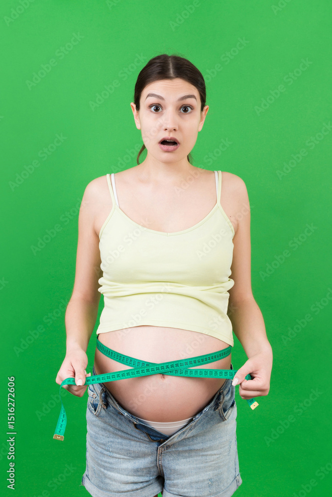 Cropped image of expecting mother in unzipped jeans measuring her pregnant belly with a tape measure at colorful background. Centimeter measurement