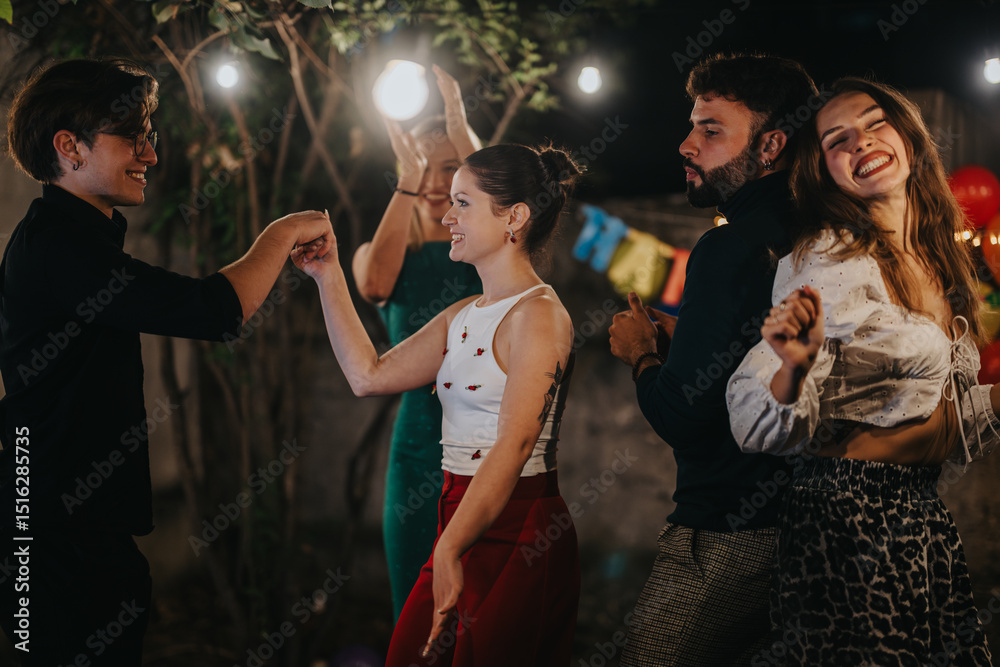 A joyful group of friends enjoys a lively evening dancing and celebrating outdoors. Each individual expresses happiness and enthusiasm amidst glowing lights and a festive atmosphere. Perfect for