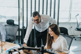 A diverse group of colleagues collaborating around a table in a bright, modern office setting. They are engaged in a brainstorming session, sharing ideas and analyzing solutions for a project.