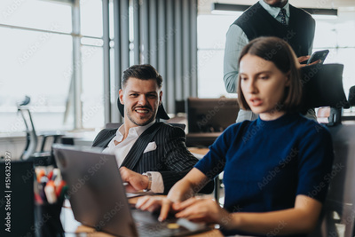 A diverse group of business people working together in a modern office setting. The image showcases collaboration, teamwork, and a multicultural work environment with digital technology in use.
