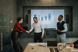 A diverse group of business people engage in a meeting, discussing data presented on a screen. Positive interaction is highlighted through a handshake and attentive listening.