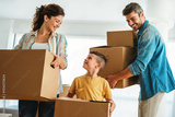 Moving, parents and child in new home bonding together, unpacking boxes for family time