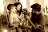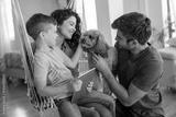 Parents with kid having fun online with application watching video cartoon or playing game on tablet