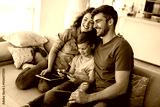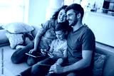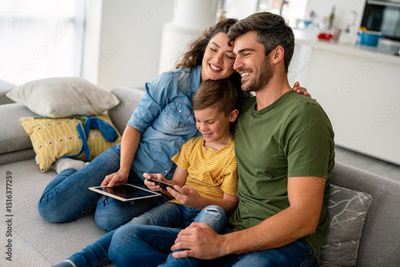 Happy family and kid having fun with smartphone, digital gadget at home. People, technology