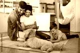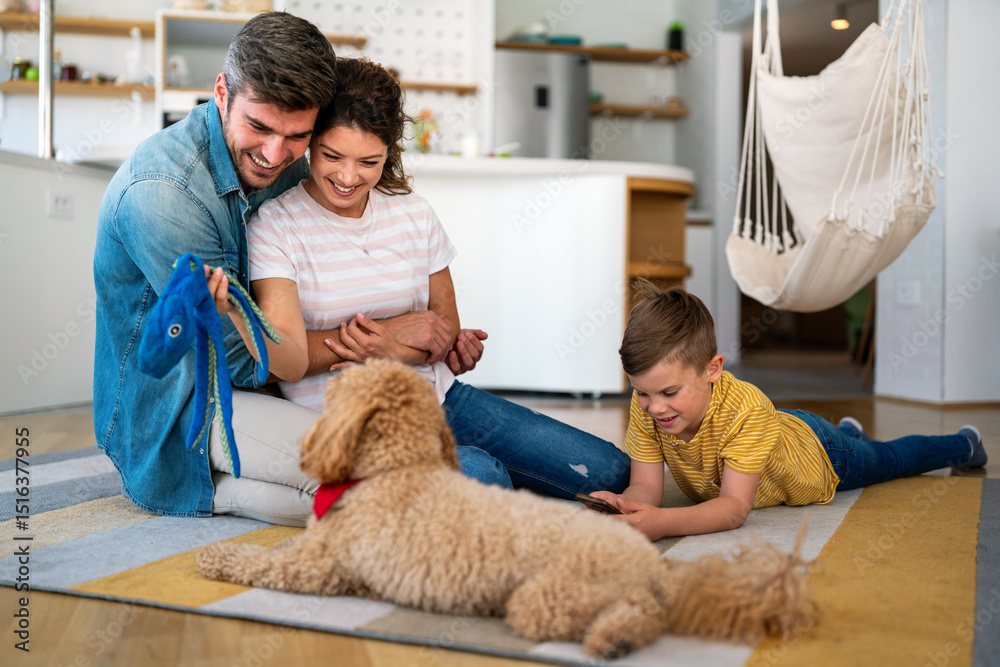 Mother, father and kid with dog in living room for quality time, love and care together on weekend
