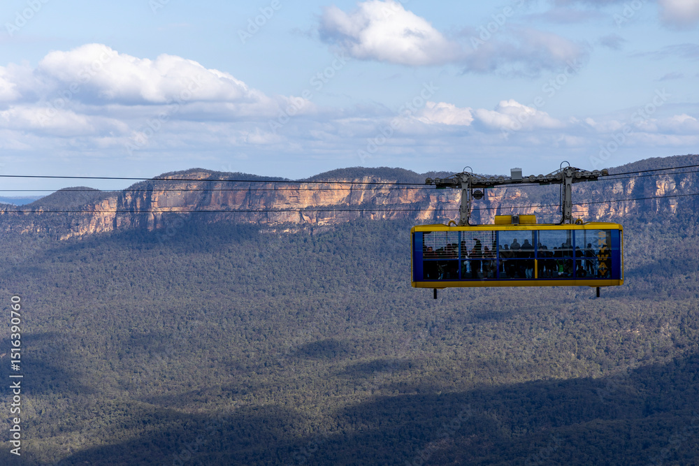 Scenic cableway ride across the Blue Mountains near Three Sisters rock formation in Australia