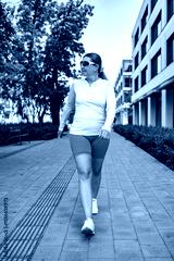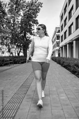 Beautiful mature woman wearing sports clothing walking in city on summer day. Front view