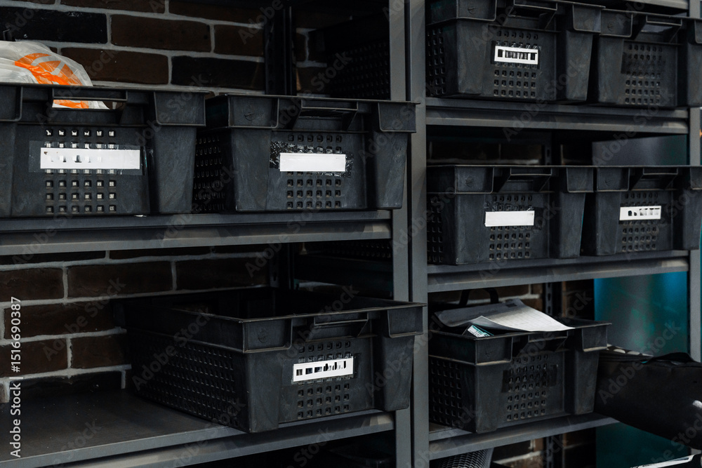Storage bins organized on metal shelving in a neat indoor space for efficient management of supplies