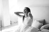 Woman stretching in bed and enjoying morning sunlight in cozy bedroom