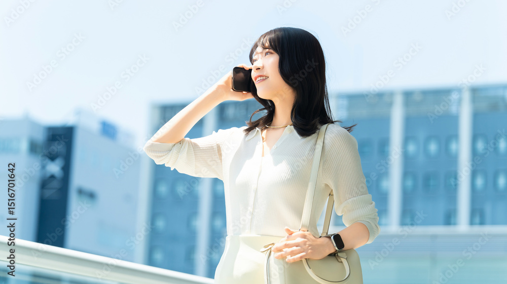 スマートフォンで話す笑顔の女性・ビジネスウーマン