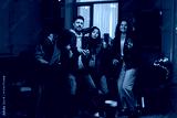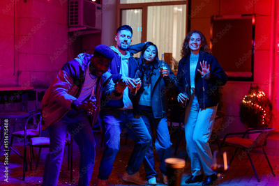 Friends enjoying a lively party with colorful lights and drinks on a festive evening