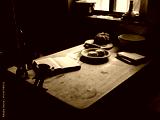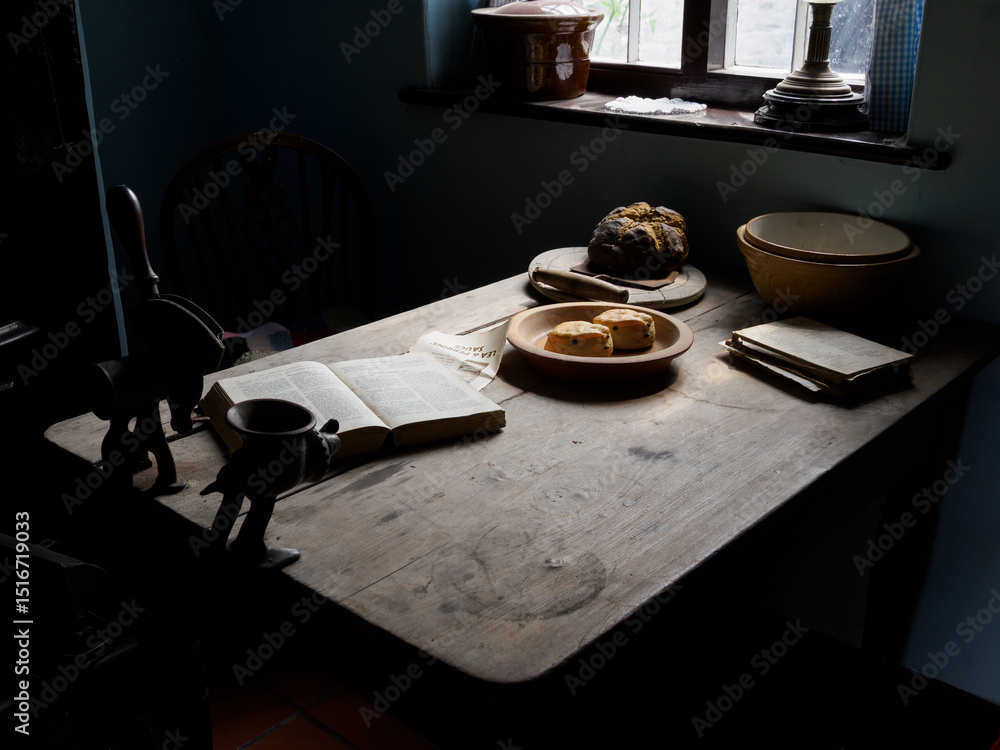 Cozy kitchen table with bread and cheese with open book in dim window lighting.