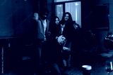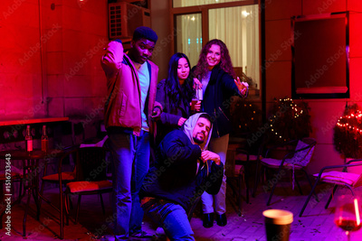 Friends celebrating together at a night gathering in a well-decorated outdoor space with colorful lights