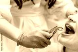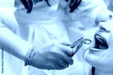 Close-up of a woman's mouth with white teeth during a dental procedure in a clinic.