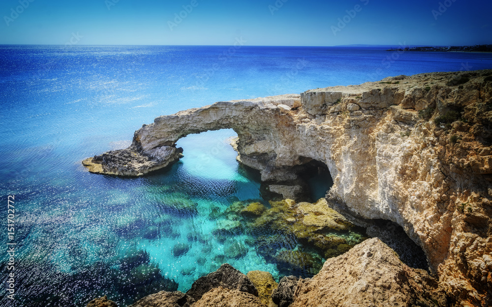 Beautiful natural rock arch near of Ayia Napa, Cavo Greco and Protaras on Cyprus island, Mediterranean Sea. Legendary bridge lovers.