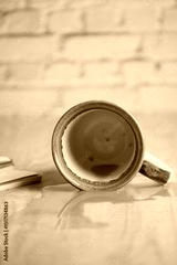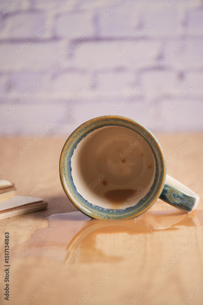Coffee mug on a wooden table with spilled liquid
